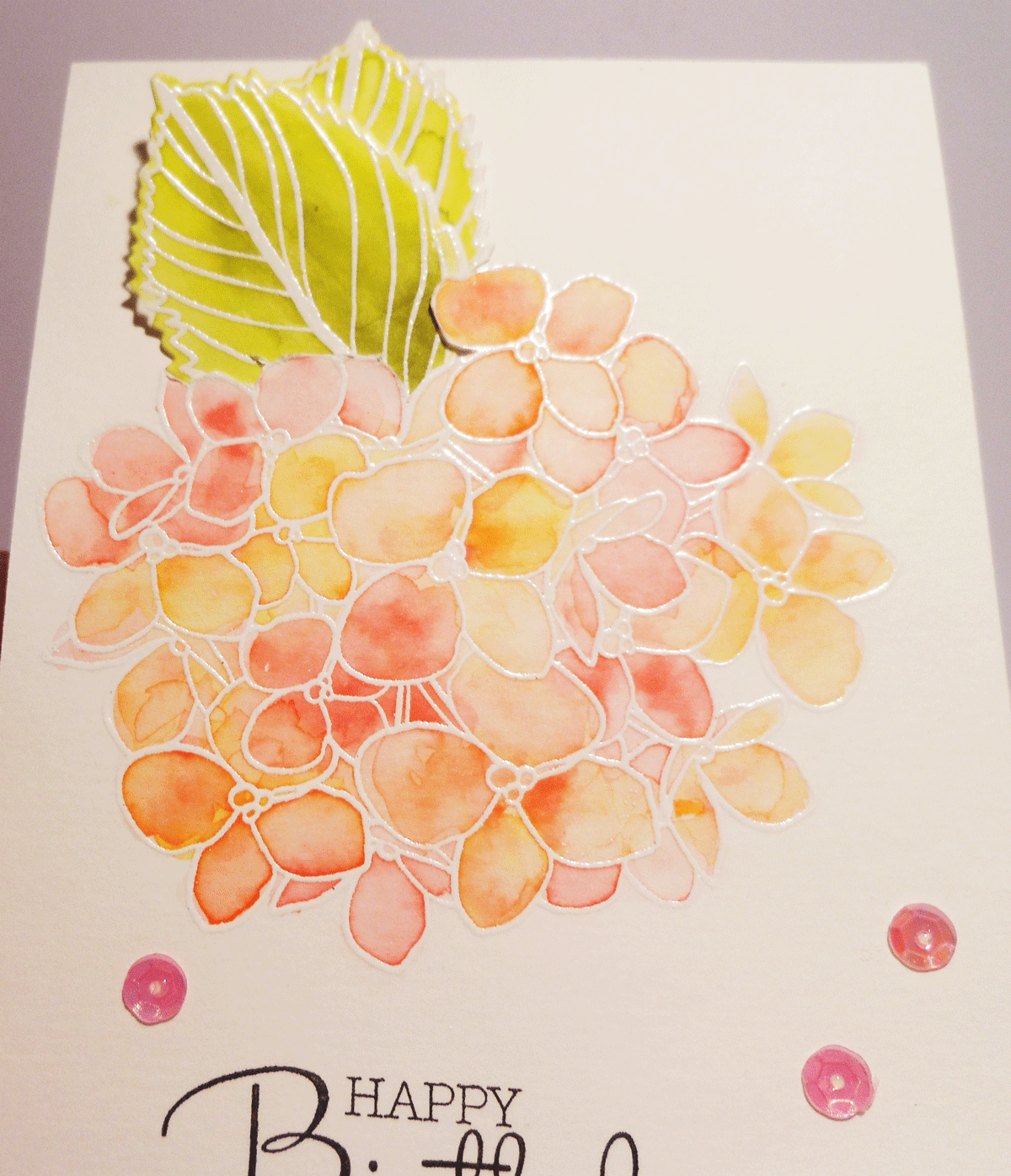 OOOO yeah! That hydrangea stamp!? Gorgeous. Your embossing and water coloring? Beautifully done, Aileen! I love it. The leaves too. Sweet! Thanks for playing along at ATSM. :)I now need to go look for that Hydrangea stamp!