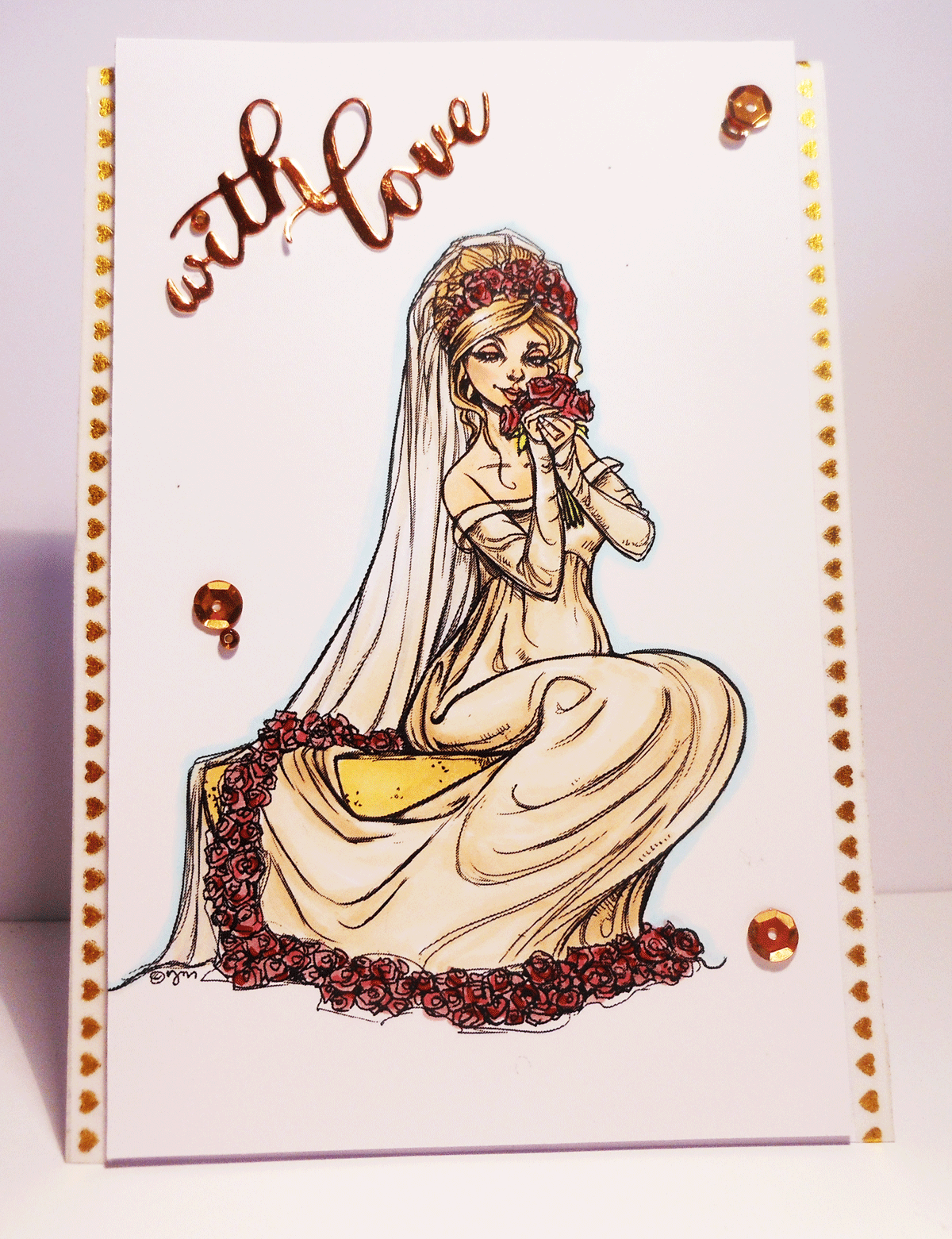foam tape so it sat just slightly higher and finished off with gold sequins and 'with love' die cut sentiment from Penny black.