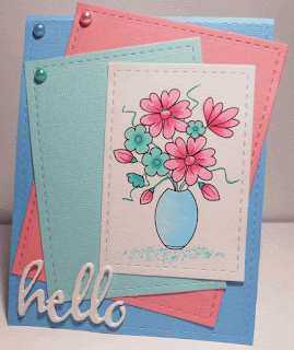 This was such a simple card to make. The image is a digital image I got so long ago I can't remember from where. Its been sitting in amongst all my print ups needing to be coloured and just waiting for the right inspiration. This Simon Says Challenge was it. I loved the colours. Used the two pinks on my flowers, the two greens on the little flowers and the blue on the vase.