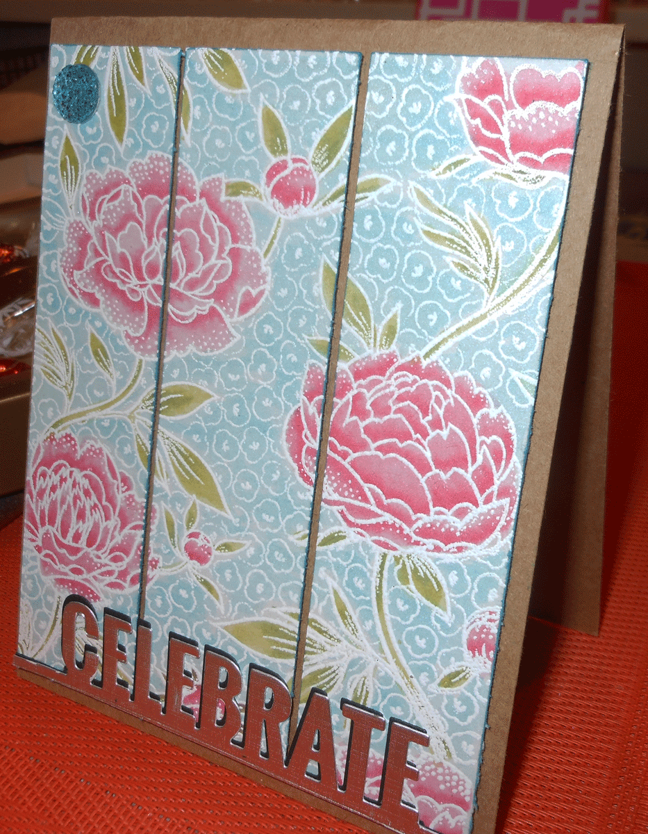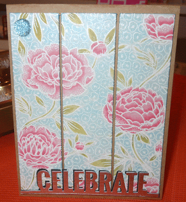Used a black and silver (trust me it is silver) Die Cut of the word'Celebrate' and layered the silver slightly off to the black to give illusion of shadow. Big blue bling in corner and its finished.