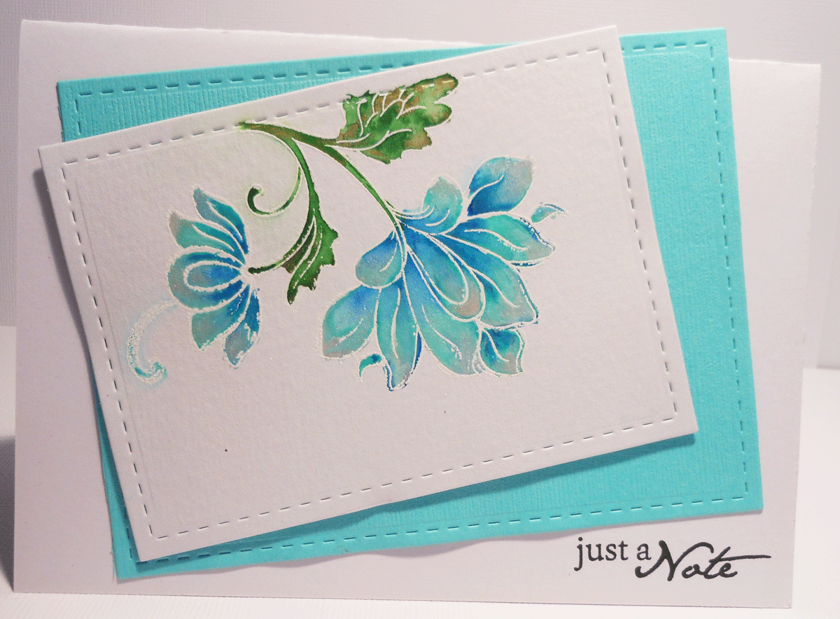 I have used the rectangle stitch dies again. The blue the next size up to the white layer. Placed at an angle and could just squeeze in my 'Just a Note' sentiment. No bling added as I think this flower is blingy itself. In real life the flower is so pretty as I have used the same paints and colours as I did for the first one. These paints as so creamy and beautiful to work with.
