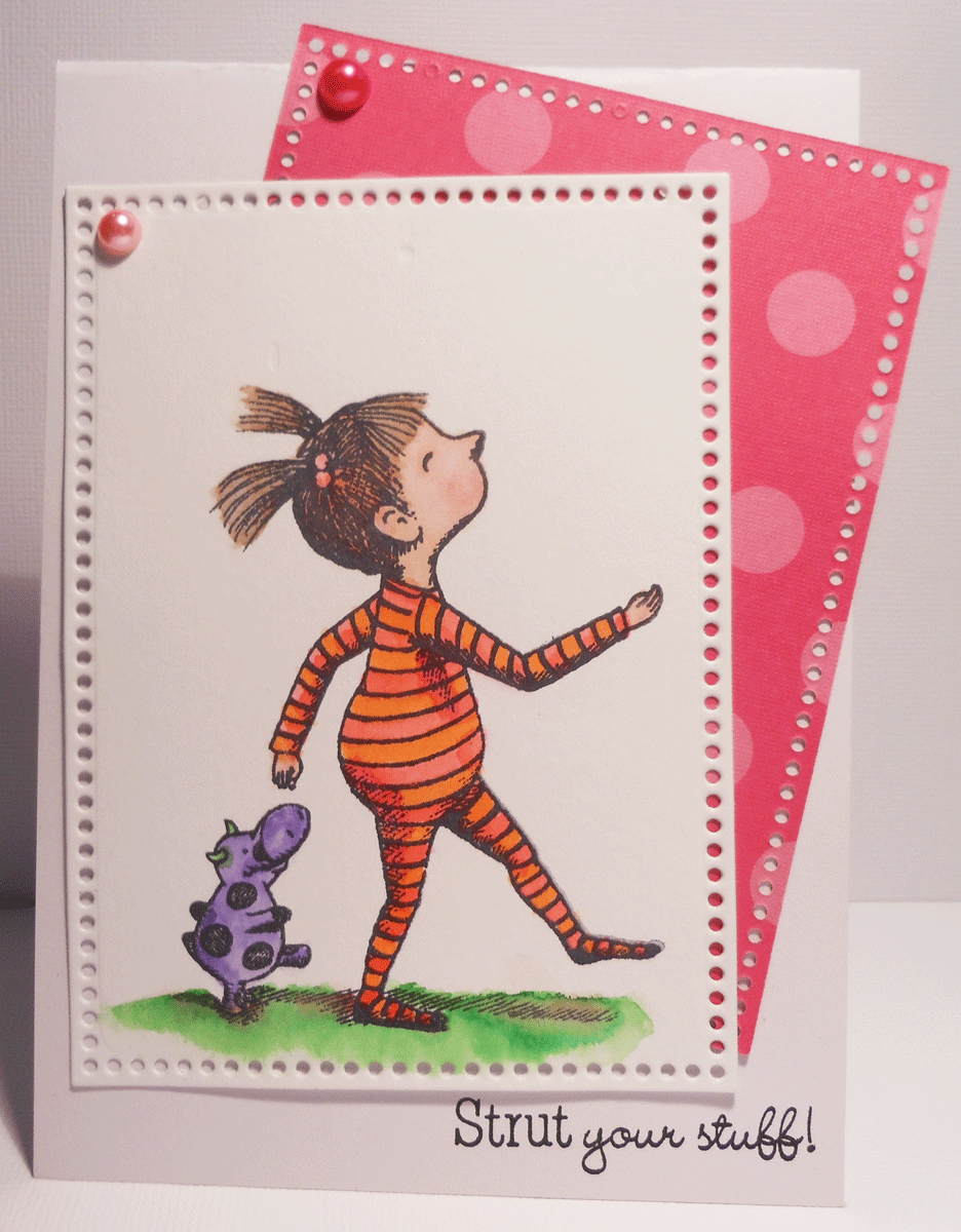 Strut your stuff - says it all. Look at that attitude. Watercolored with Peerless Watercolours. She was actually coloured in the last challenge but I hadn't doe anything with her so I thought I would play with the word colouring as I set her up on her card and played around with finding the right colouring for the background matt!!! and gems!!