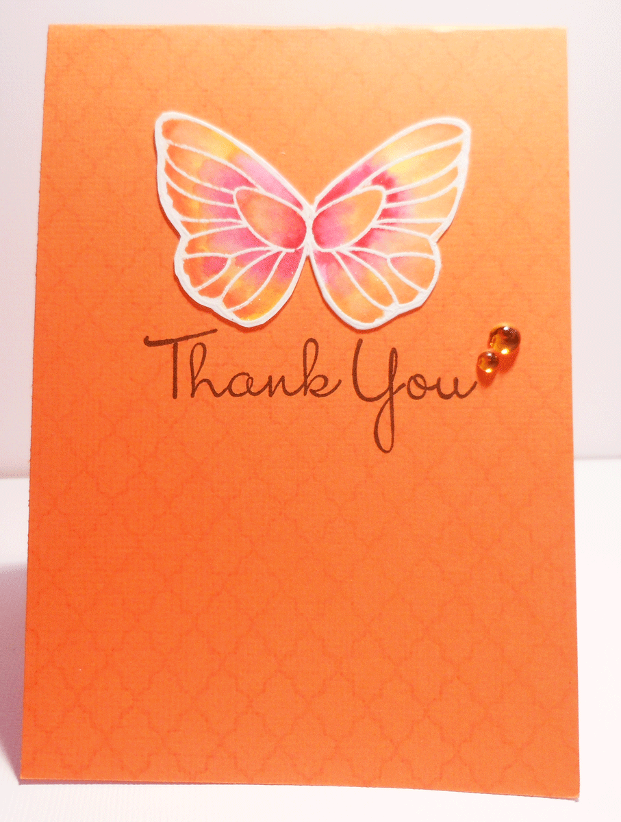 This is a Unity background stamp, first time used and very nice. Orange and pink used for this butterfly. Looks better in real life. I think I lightened too much to show background off.