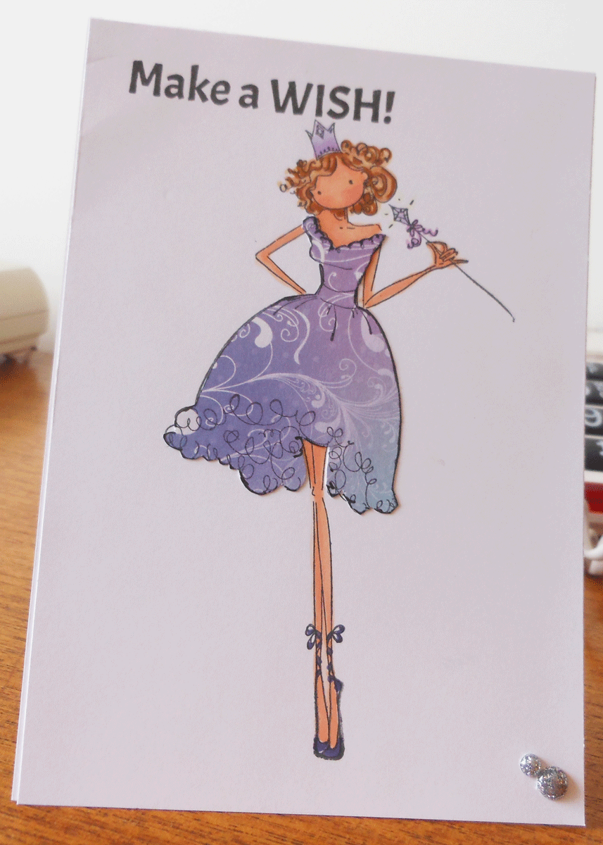 I stamped a second time on a scrape of patterned paper for the dress. Coloured the crown and wand the same colour. Photos aren't the best but I have less choice at mum and dads so settle for ok.