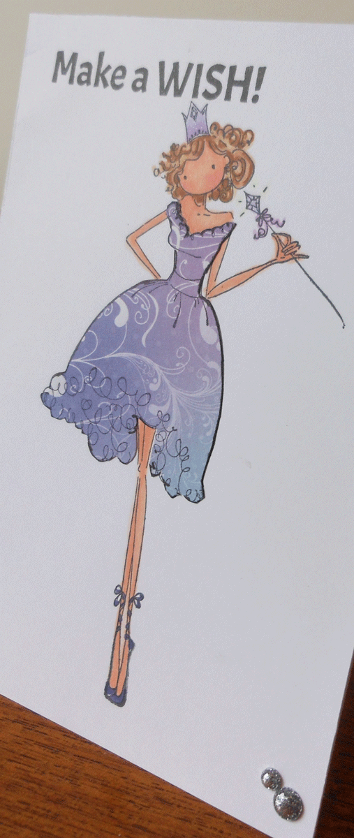 Isn't this the cutest stamp. So easy to colour in when you decide to paper pierce the dress. Was done in a matter of minutes. These girls are all so tall and have the longest, skinniest legs, and easy to colour faces. A wee bit of bling, don't know why my Wink of Stella is just not showing up