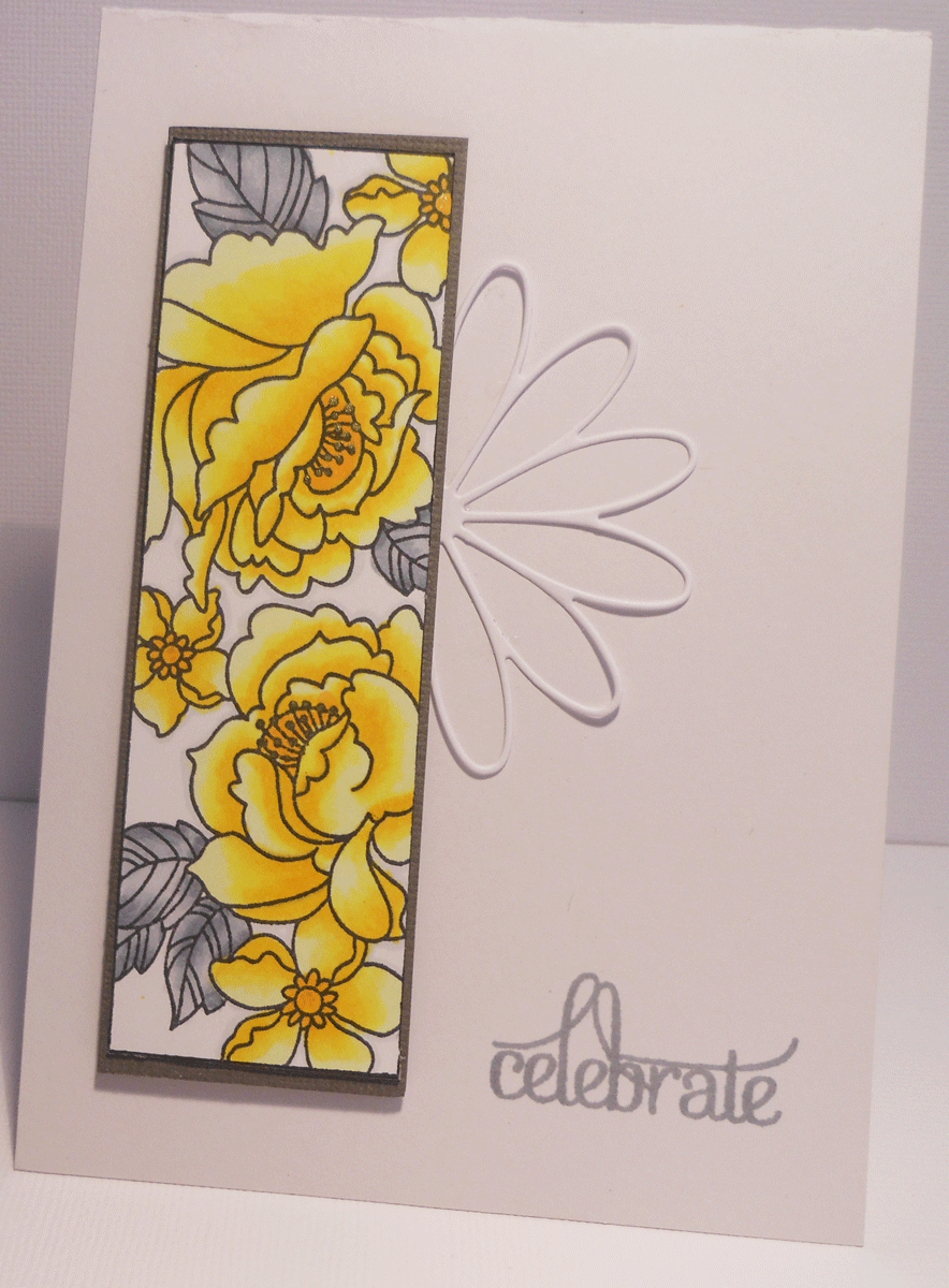 Have you ever made a card, then thought mmmmmm I know I saw something like this before. Well I think this is called subliminal memory. After I finished colouring in 5 panels cause I never do anything by halves I finally got to the yellow and grey and thought I would enter the colour challenge with white/yellow and grey. Grey leaves, darker grey panel under the peony panel.