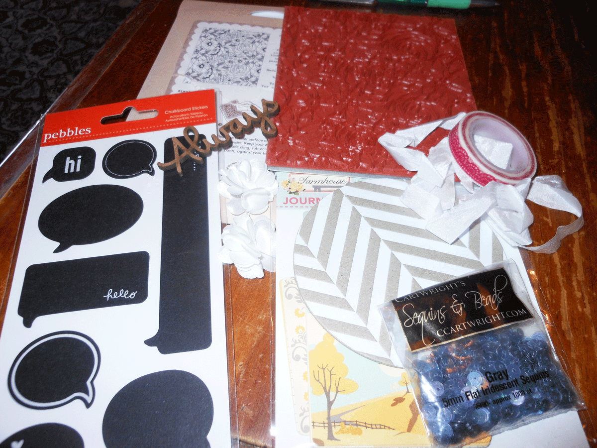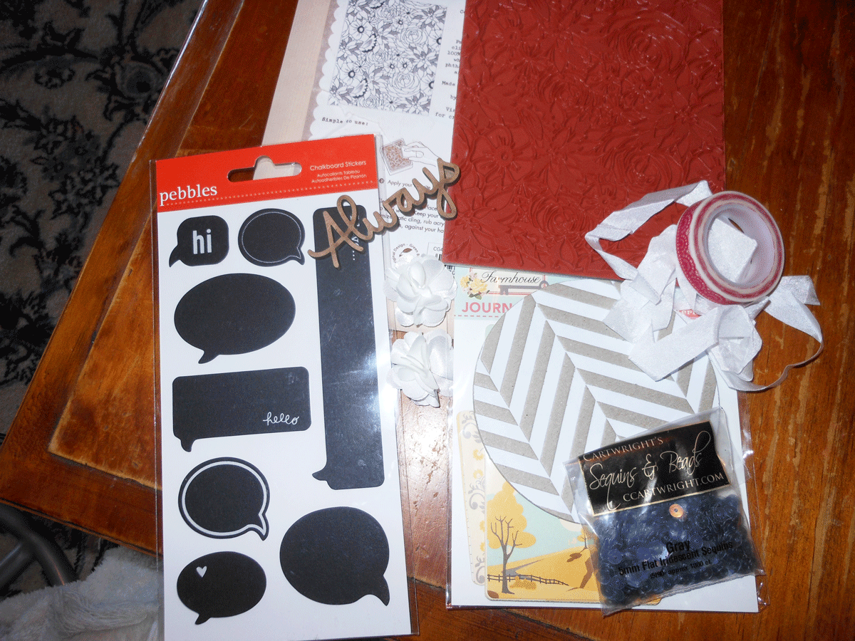 The grey and white item is thin grey chipboard with the pattern like embossed white -cool oooh. Grey sequins, chalkboard tags, journal cards white ribbon, white ribbon flowers, wood 'always' red lace washi tape. I couldn't thank Simon Says enough, so nice.