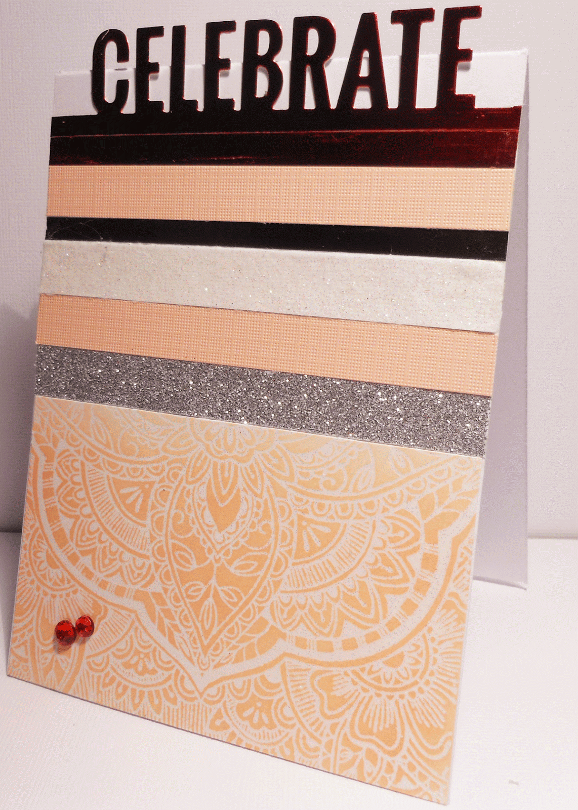 You can see how light the blending is here. This is the soft tull of the dress.I then added bands of different paper products to represent the bodice of the dress. Silver glitter paper, Peach coloured cardstock, white sparkly paper that is more like a material than a paper, a thin band of shiny black paper, the peach colour again then the red shiny card stock that I cut the Celebrate out of.