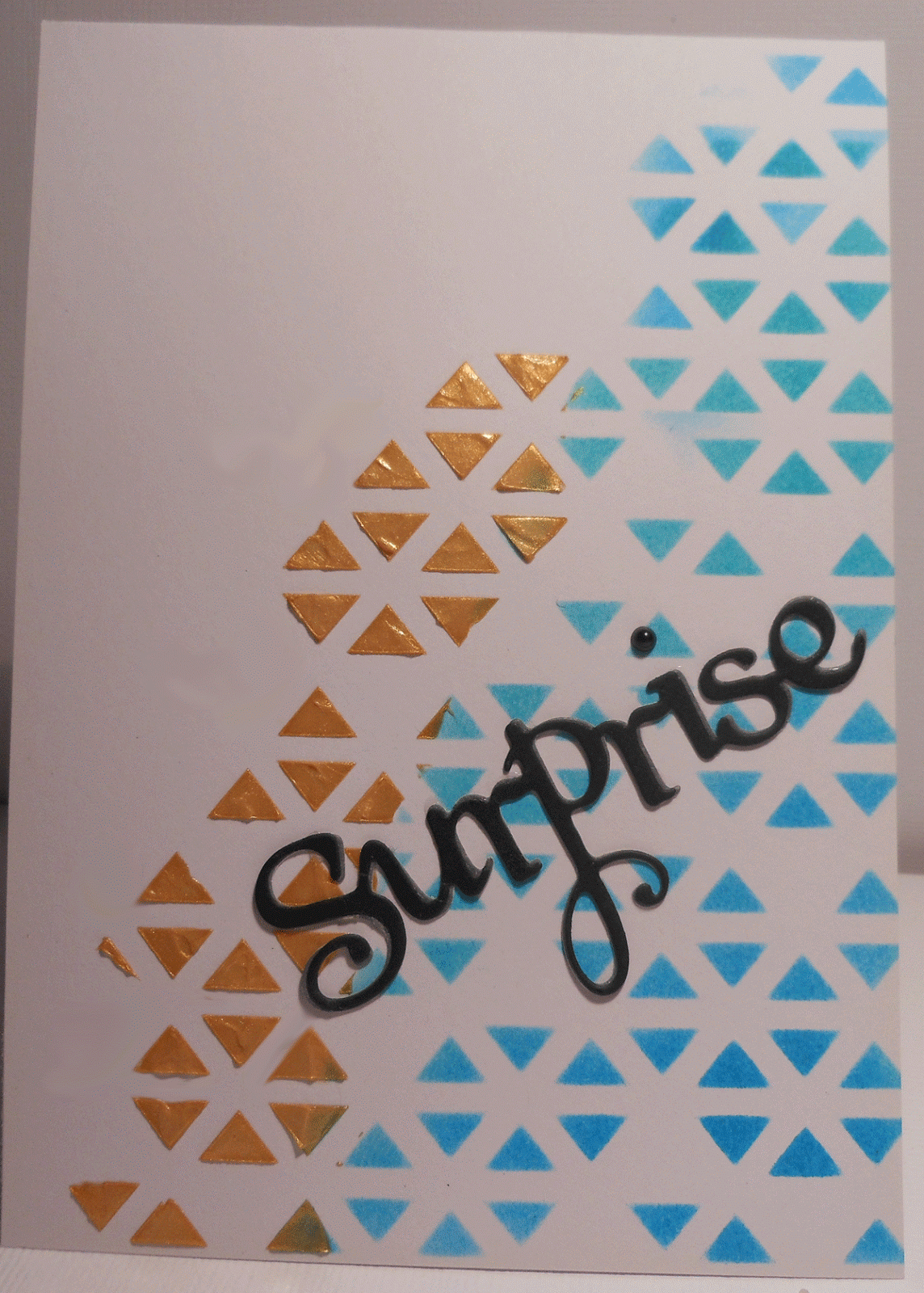 I die cut Surprise in grey and then in black attached the black on top. Used a very small black gem for the dot on the i as that had disappeared.
