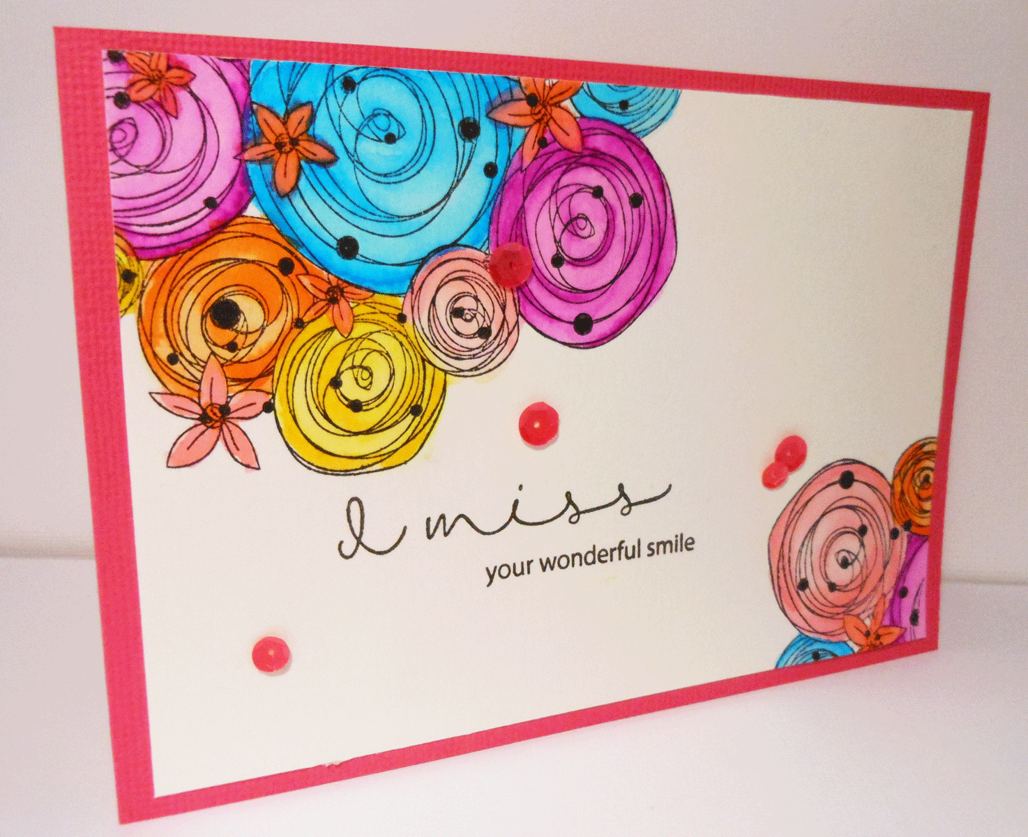 Finished the card off by mounting the panel on some strong pink cardstock and a few pink sequence here and there. I also went back of the black dots on the flowers with black liner pen as they had faded a bit with all the watercolouring I was doing - you know add some colour, remove some colour, add some more colour no remove a bit, on and on.......
