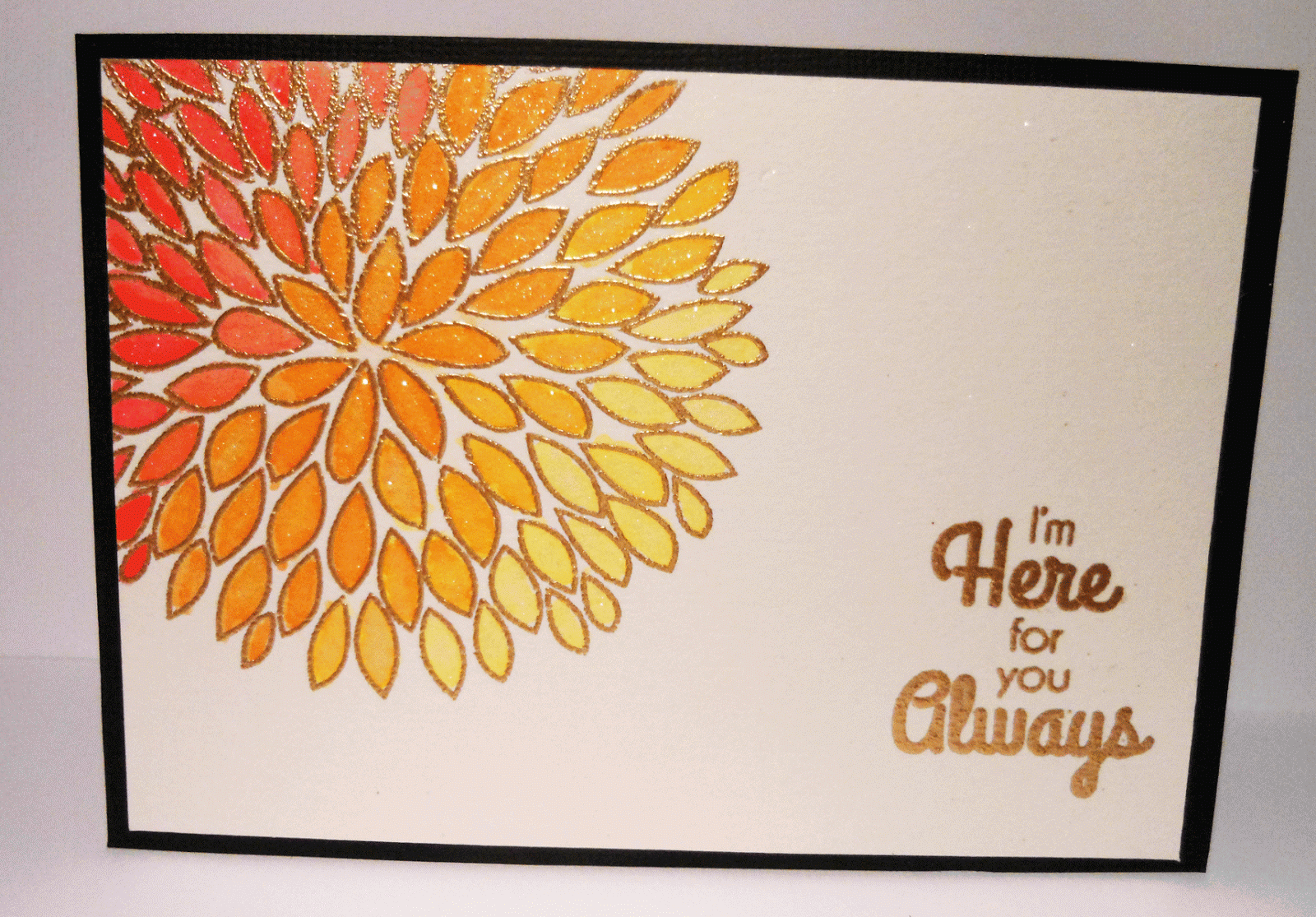 Started with orange in the middle then orange with yellow then yellow on its own. the other direction is orange with a little red added then red on its own. It didn't matter that the cardstock was not watercolour paper as very little water was used.