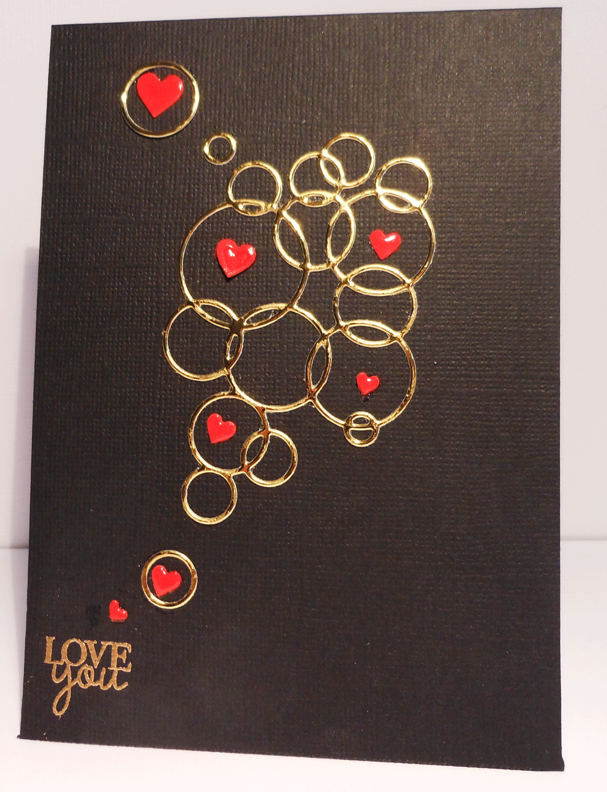 I then gold embossed the Love You sentiment at the bottom of the card with a small heart floating up to become lots of loving thoughts floating to the one I love.