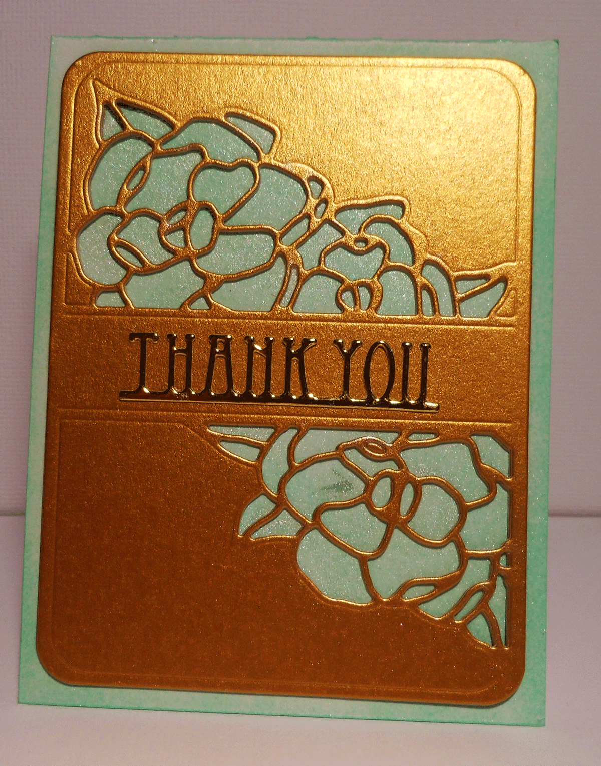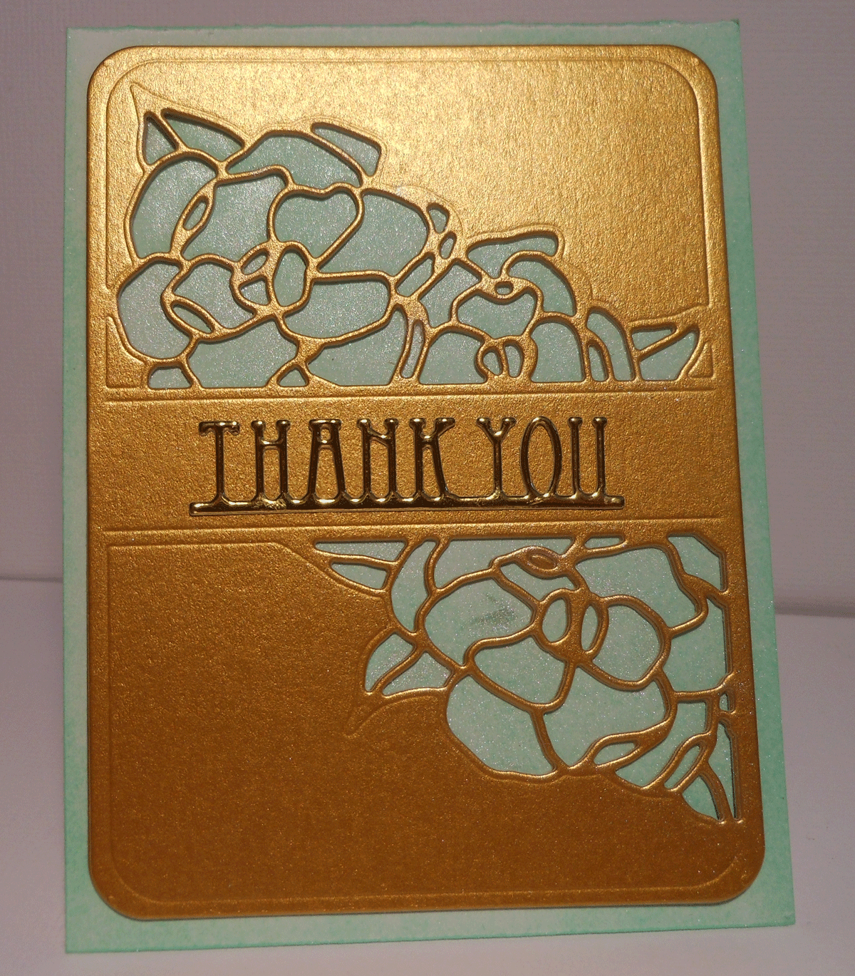 Was going to stamp but ink doesn't work well on this gold card stock so I used another die cut. The 'Thank You' die was cut in gold as well but a very shiny metallic gold. It works IRL - trust me on that.