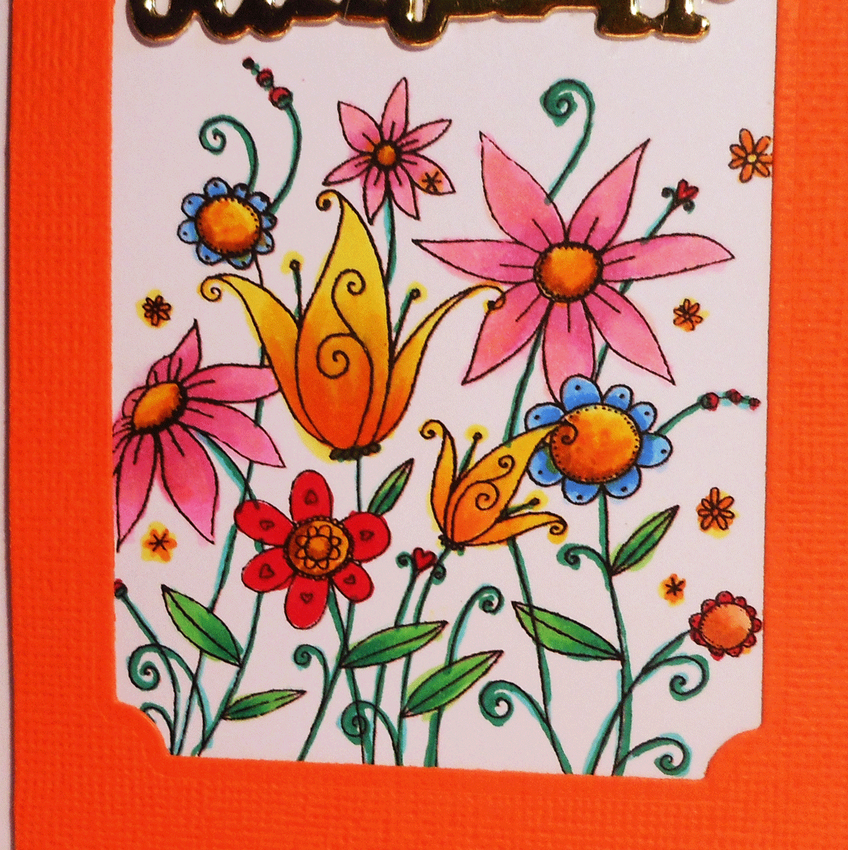 As you can see I have copic coloured, its a really eye catching bunch of flowers. I used the negative from a die cut that I made out of the orange and turned it into a frame for the flowers.