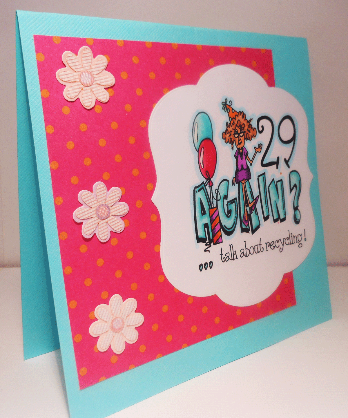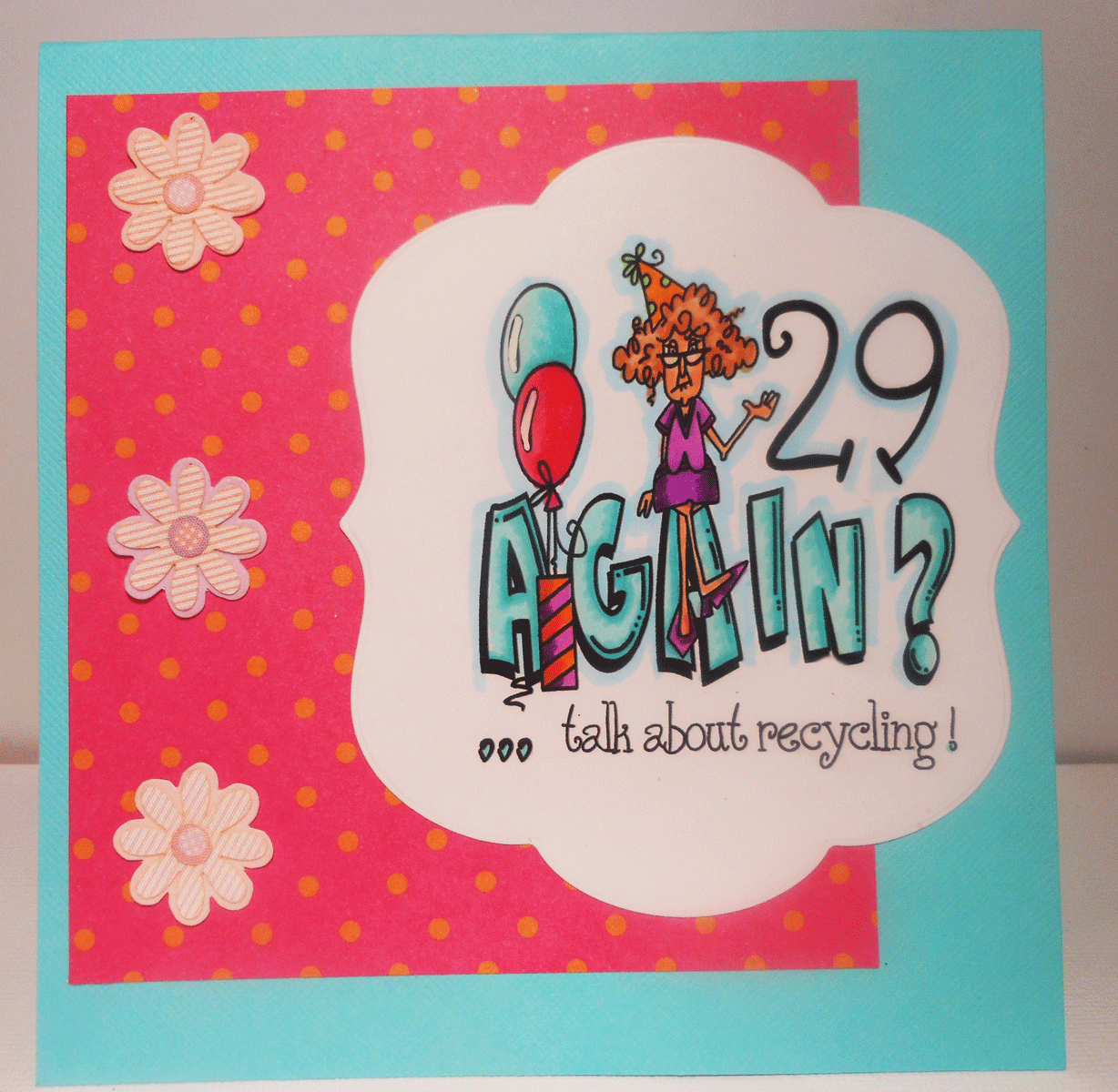 Hahahah! That's brilliant! Nice colouring and I love it on the blue background too with the pink paper. Didn't you know that once you get to 30 you start going backwards in age? So currently I'm not heading for 40 this year, I'm going to be 20....