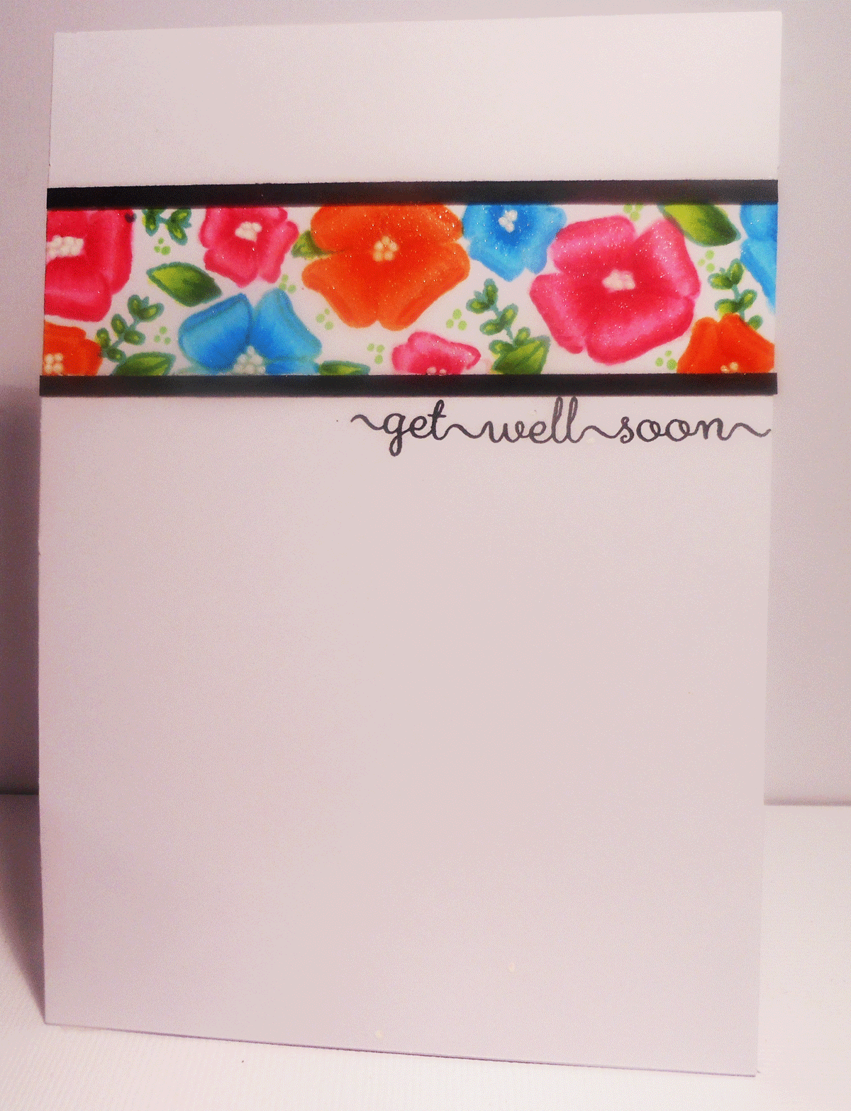 This is Anita's card and I took inspiration from the black strips, flowers between the black strips and the 'get well soon'. Love her card and enjoyed entering this challenge.