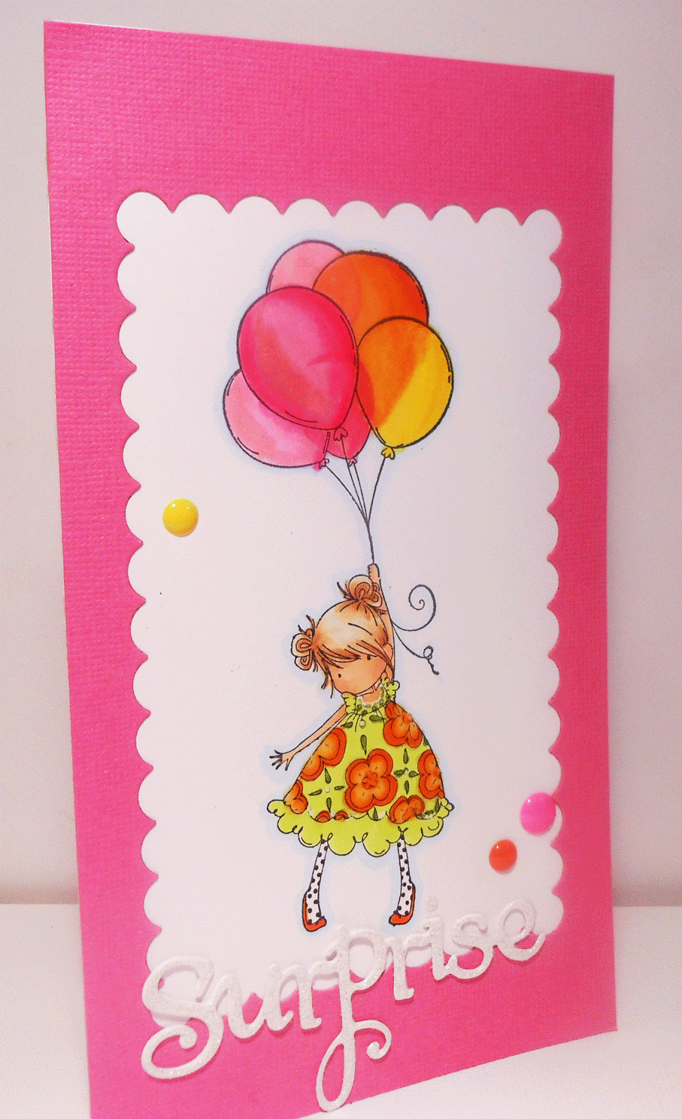 For my sentiment I wanted to use the die cut 'Surprise' as she is dropping in on the party so cut that from white glitter paper and finished off the card with a few little enamel dots that I did in a mix of colours to go with the balloons.