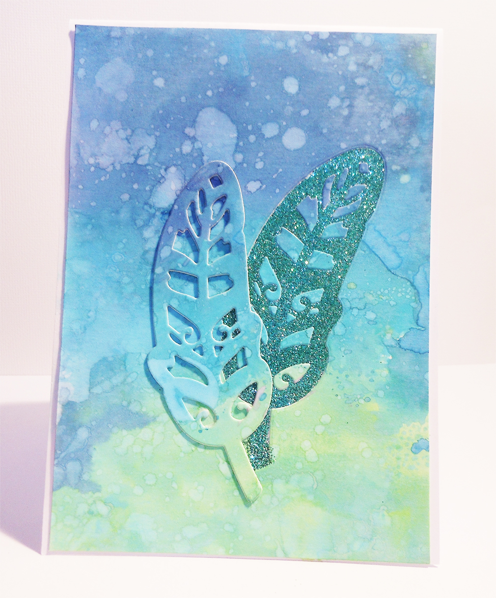 I stamped the butterfly twice and coloured the full butterfly once and the top layer of the wing again so I could layer up. I fussy cut the butterfly. Then lined it up in the Misti, used masking tape to