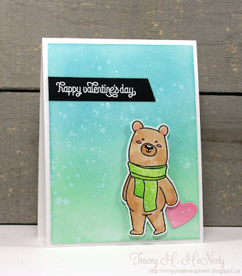 This week its Tracey McNeely and I just love her card. The soft bending, the water flicks. The cute little critter with the heart and the sentiment all appealed to me.